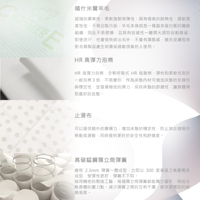 ● 商品名稱:A103-03-2 美國伊麗絲凱薩喀什米爾羊毛獨立筒床墊/另售3.5尺及6尺