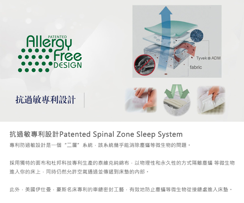 ● 天然乳膠:天然乳膠具持久性、優越的彈性、自體透氣與濕度調節、卓越的身體支撐與符合人體工學及抗菌與衛生之功能。