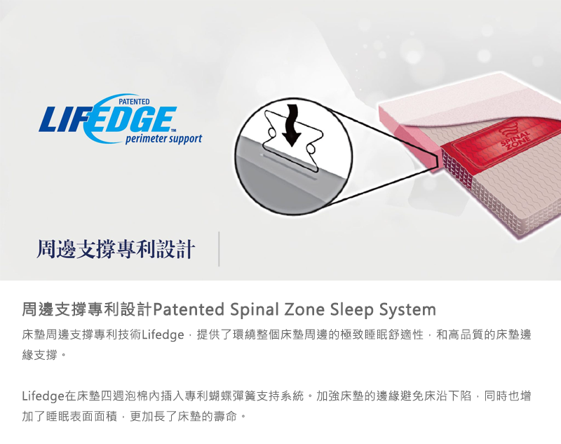 ● 啞鈴型英國鋼8環獨立筒彈簧:上段間隙大,受力面積廣,能完整貼合並緩衝身體重量。 中段間隙,彈簧直徑縮減,反饋彈力提高,增加身體重量下沉的反作用力,下段間隙大,受力面積廣,能完整貼合底層並緩衝身體重量。